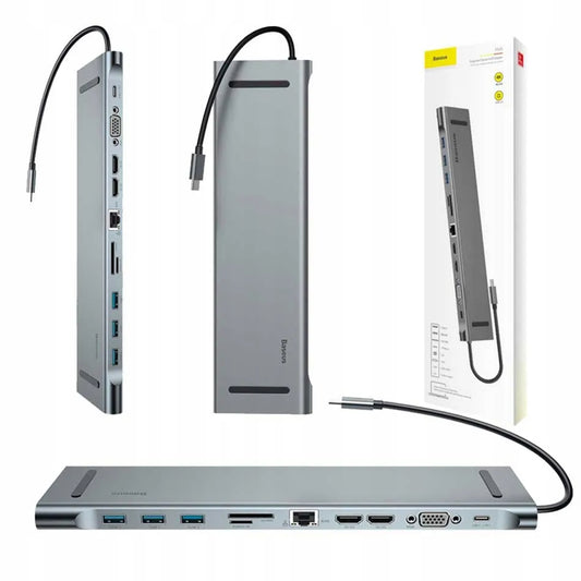 Baseus Enjoyment Series | 11-in-1 Intelligent HD HUB | USB-C Interface | 100W PD Input | 4K HDMI + VGA | RJ45 Gigabit Ethernet | SD/TF Card Readers | 3 × USB 3.0 + 2 × USB 2.0 | Audio Jack | Aluminum Alloy | Dark Gray