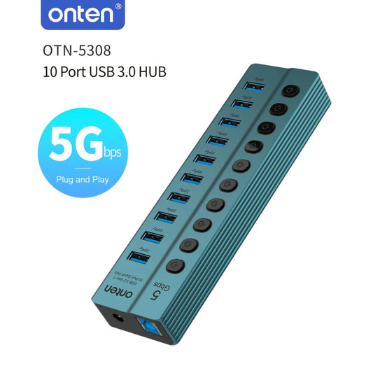 Onten 5308 | USB 3.2 Gen 1 10-Port Hub | Individual Power Buttons | 5Gbps Transfer Speed | LED Indicators | Plug & Play | For Flash Drives, HDDs, Phones, Keyboards, Printers
