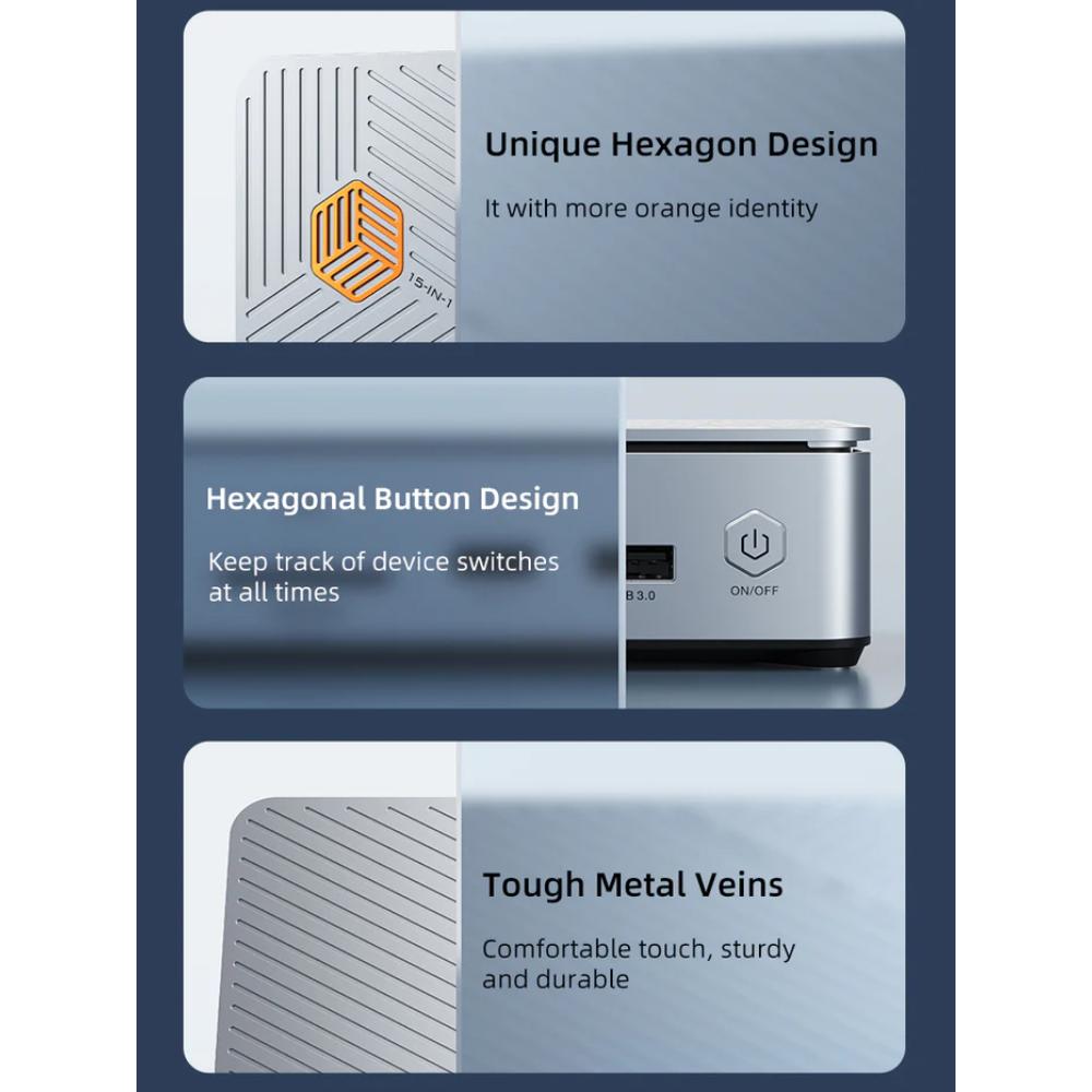 The CABLETIME CB14G 15-in-1 USB-C Docking Station is a premium, high-performance desktop docking hub designed for professionals who demand maximum connectivity, speed, and display flexibility. Featuring triple-monitor support (2× HDMI + 1× DisplayPort) with resolutions up to 8K@30Hz or dual 4K@60Hz, this docking station transforms your USB-C laptop into a full-scale workstation. Its durable aluminum alloy hexagonal design ensures efficient heat dissipation and a sleek, modern aesthetic ideal for both offices and creative studios.