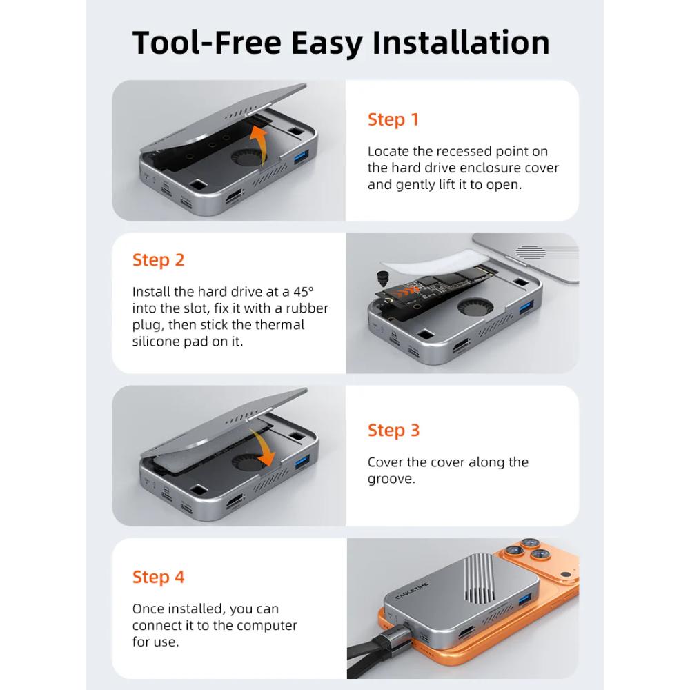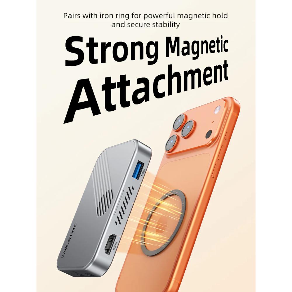 The CABLETIME CB34S 7-in-1 Magnetic USB-C Hub is a next-generation all-in-one solution designed for creators and professionals. Featuring a built-in NVMe SSD enclosure, 4K60Hz HDMI output, 10Gbps data transfer, and 100W Power Delivery, this compact hub transforms your device into a powerful mobile workstation.