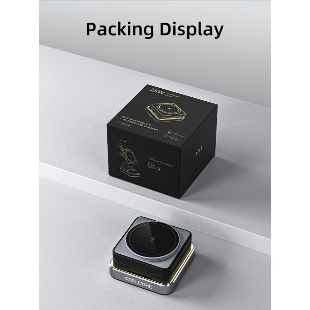CABLETIME CE12B 3-in-1 Foldable Magnetic Wireless Charger Stand is designed for Apple users seeking convenience, speed, and style. Featuring 15W fast charging for iPhone 12–16 series, 5W for AirPods, and 2.5W for Apple Watch, it powers all your essentials simultaneously with advanced magnetic alignment and safety protection. Its sleek aluminum alloy base, compact foldable design, and adjustable 90° tilt make it ideal for home, office, or travel. A full-circle LED night light with memory brightness adds both functionality and elegance to your charging setup.